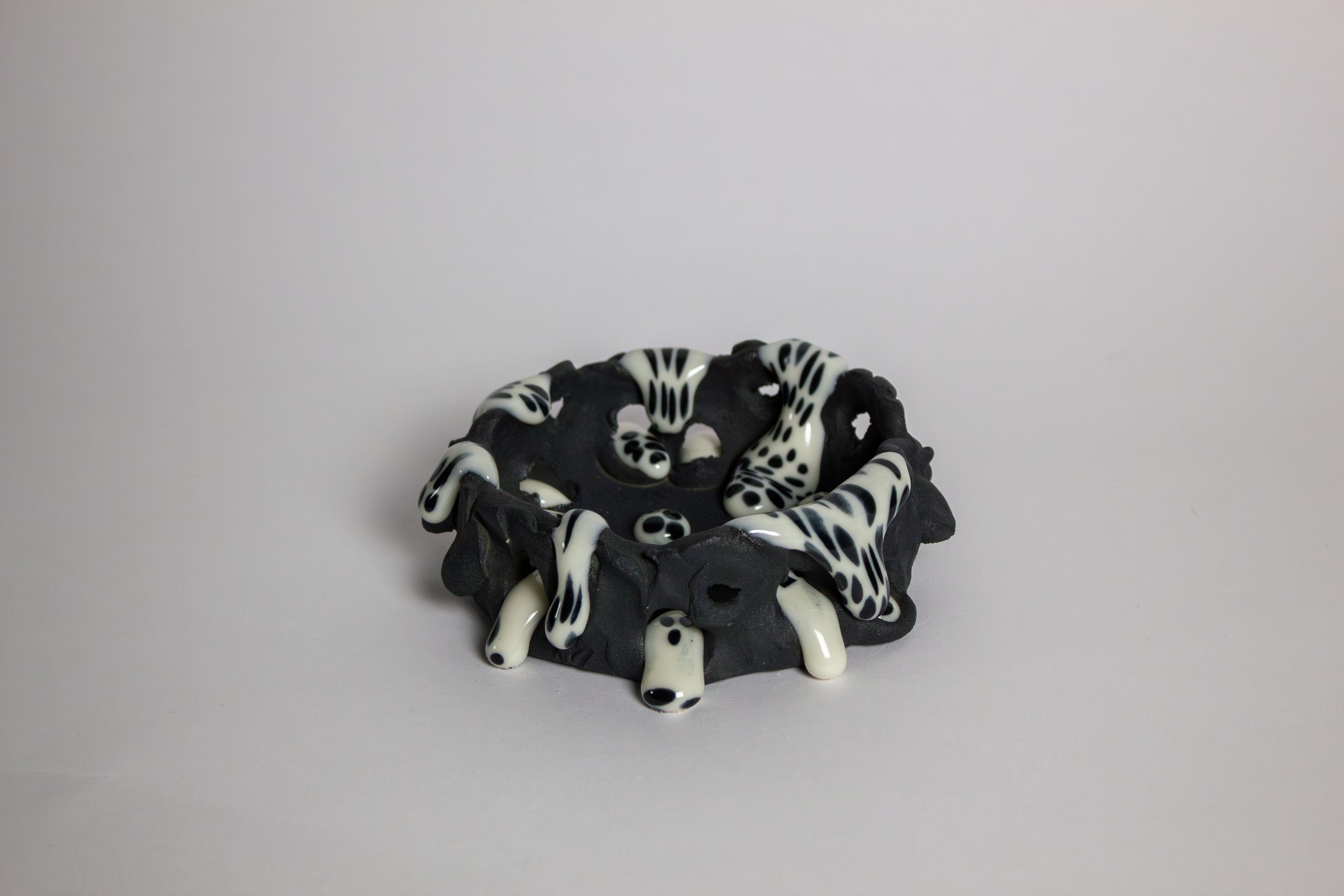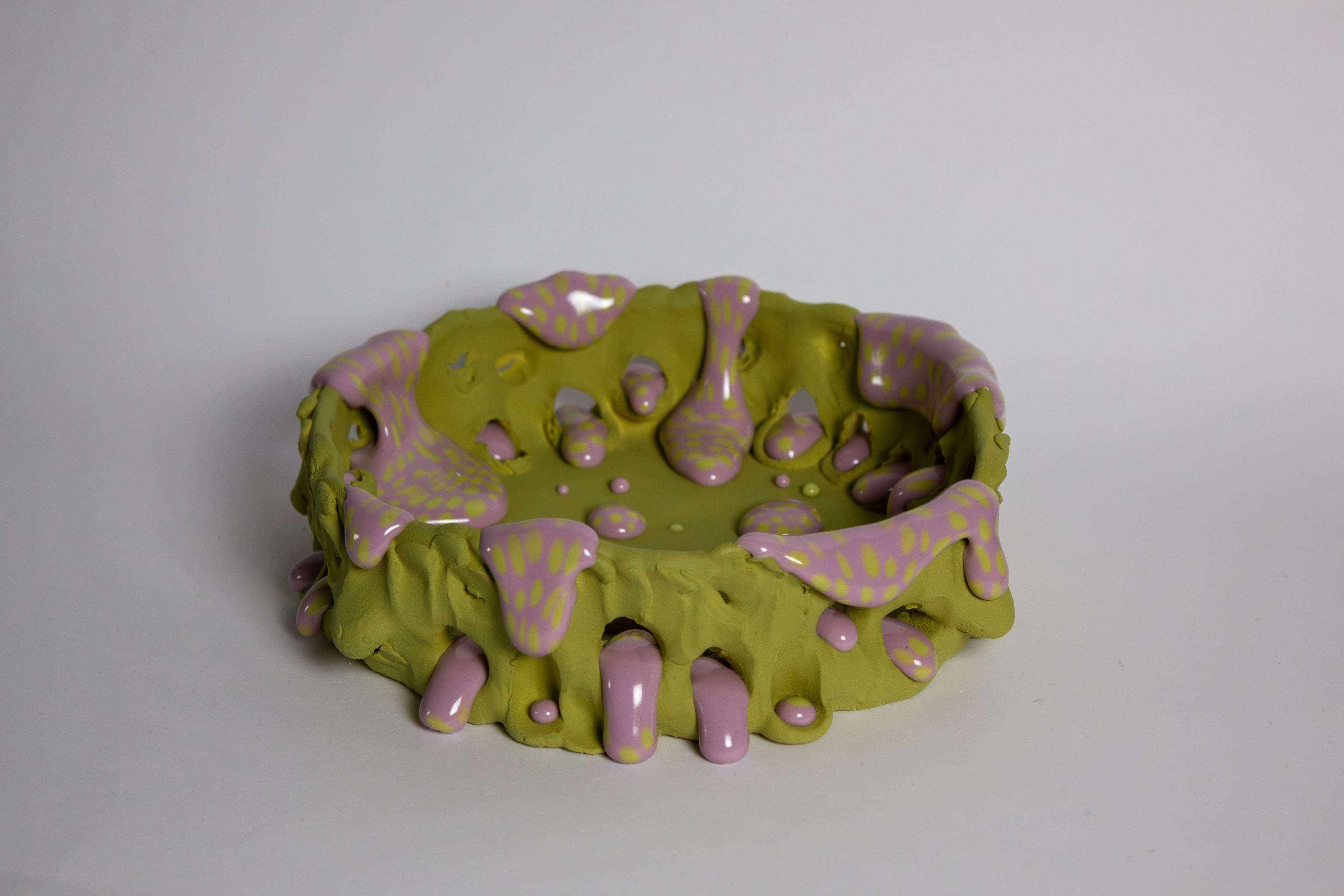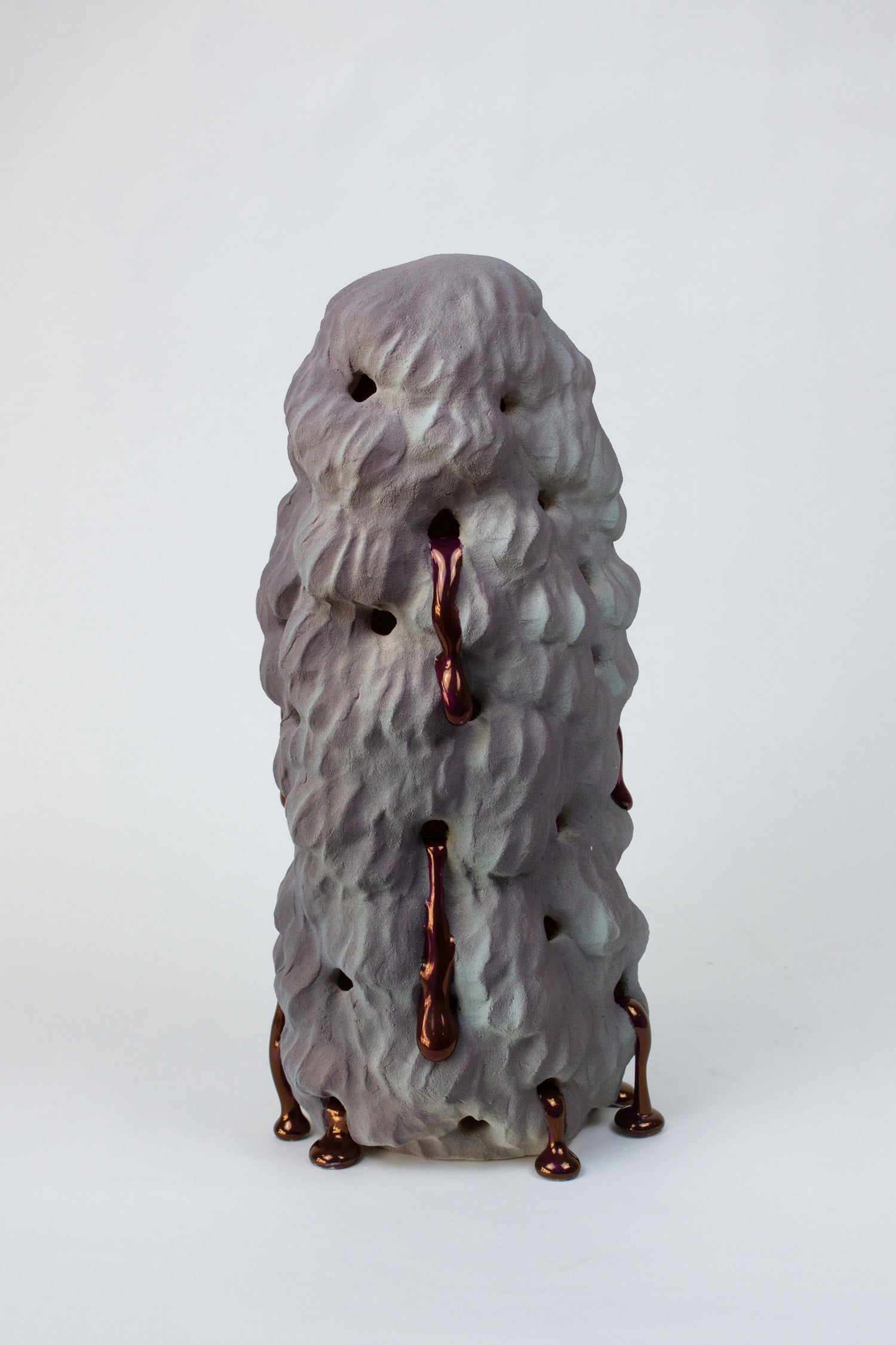 私の彫刻は「転生された静物(インカーネイテッド・スティルライフ)」として構想されている。色彩やパターン、表面効果によって、すでに失われたかのように見える場所に再び生命を立ち上がらせる。私は独自の釉薬レシピを開発しており、そのひとつである「グループ(gloop)」は、粘性のある光沢素材で、粘土のように成形され、マットな表面へと溶け出すガラスを模倣している。液体と固体のあいだに宙づりになったこの曖昧な増殖体は、内側で今なお進行中の変容、内的な動きを示唆している。」
