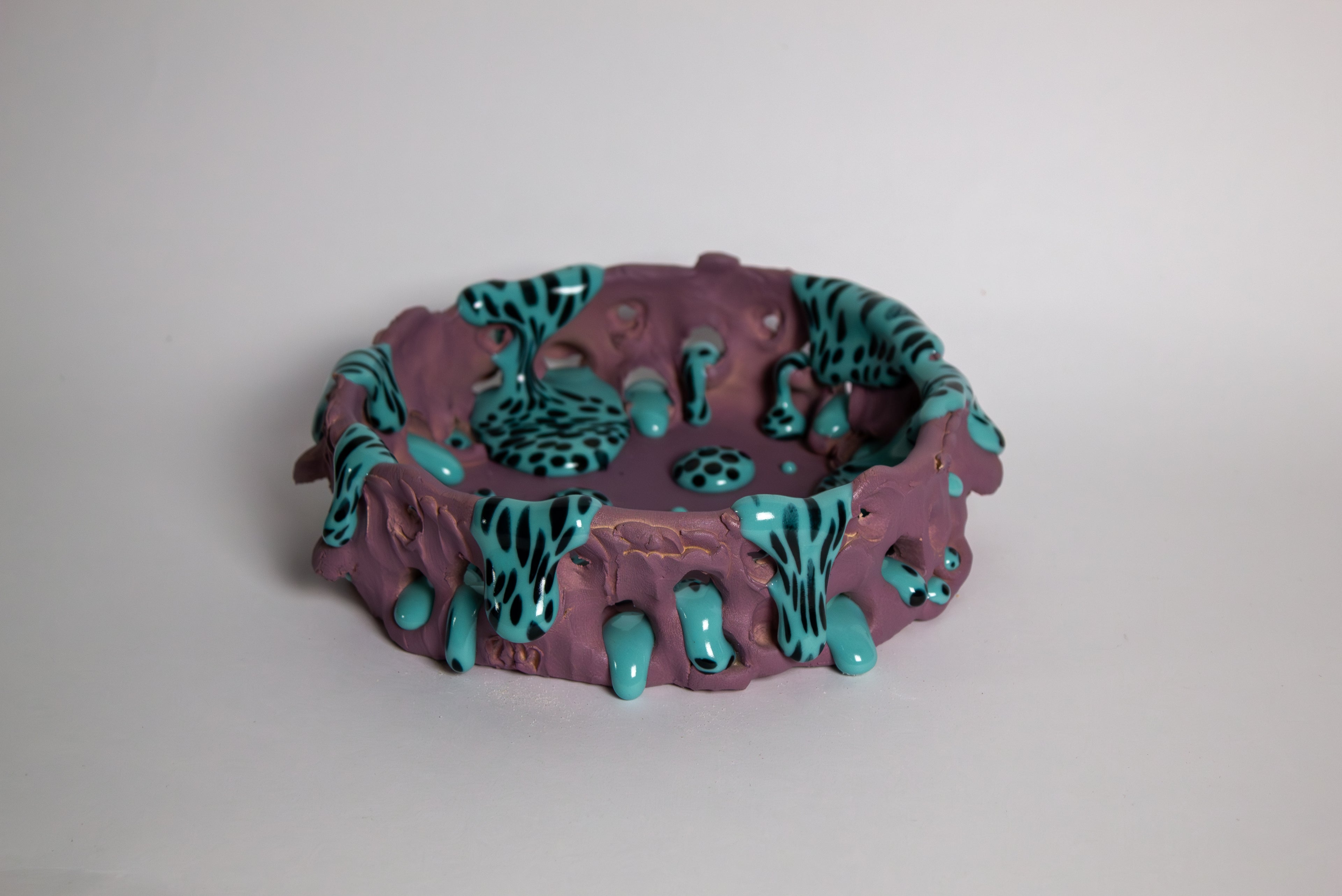I conceive my sculptures as “embodied still lifes”. Color, pattern, and surface effects allow life to emerge where it seems to have withdrawn. I develop personal glaze recipes, including my “gloop” : a viscous, glossy material modeled like clay, mimicking molten glass overflowing onto matte surfaces. These ambiguous growth, suspended between liquid and solid, suggest an inner movement, a transformation still in progress.”